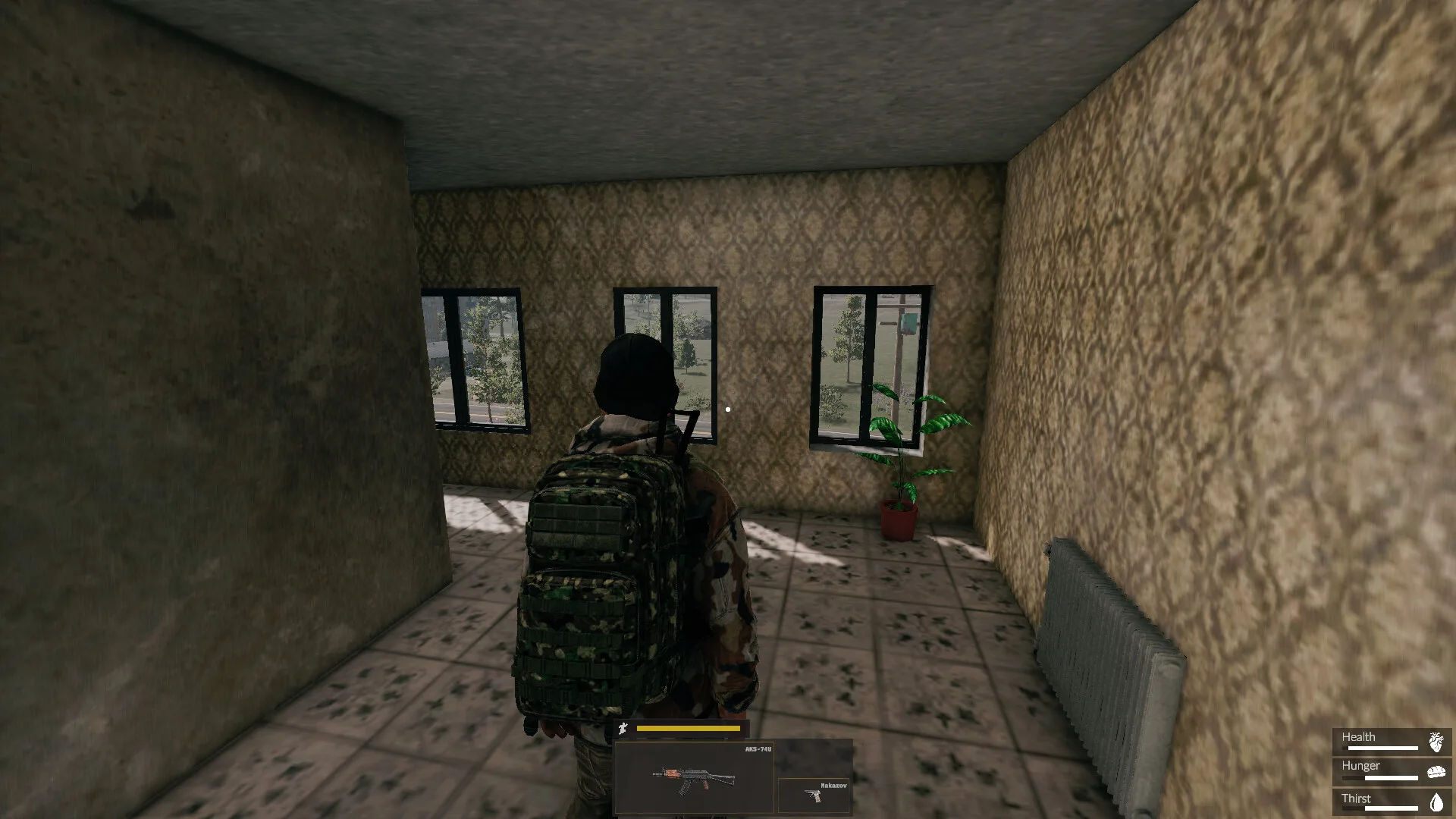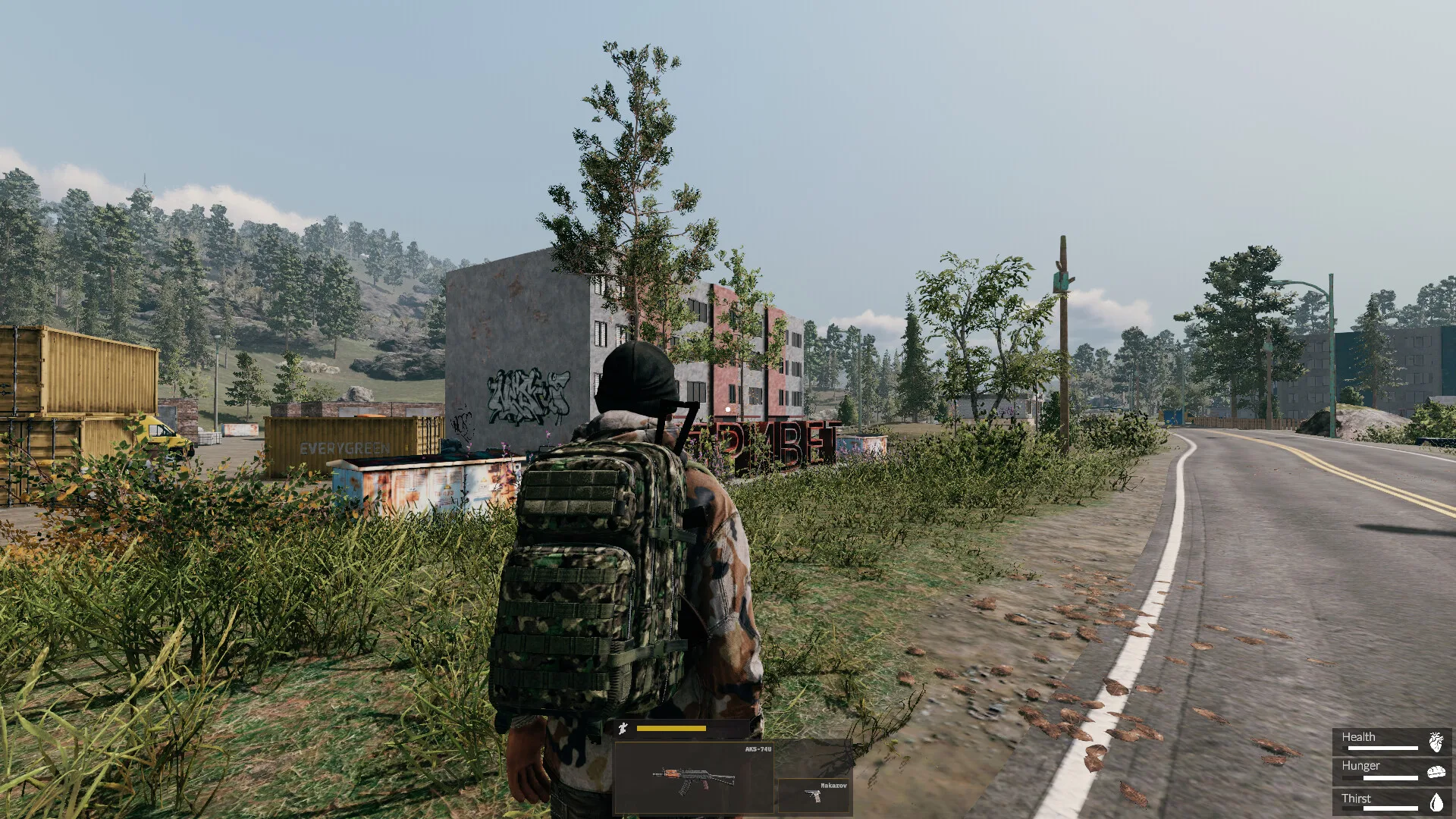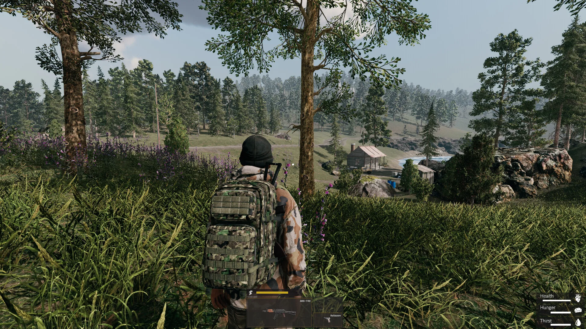 Pemain harus mengelola kesehatan, rasa lapar, dan haus untuk bertahan hidup. - Sistem Senjata dan Perlengkapan